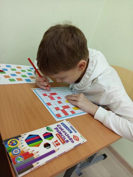 - Штриховка и раскрашивание геометрических фигур: Дети с интересом учились различать и заполнять цвета, что помогло не только развить их творческие способности, но и понять, как выглядят формы и цвета. Каждый из них смог создать свои уникальные произведения искусства!